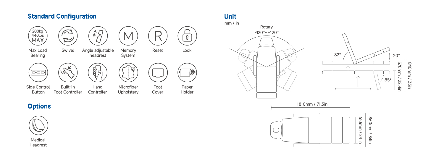 Engineered for versatility and hygiene, the 2403EB comes equipped with an adjustable headrest and removable upholstery crafted from premium medical-grade silicone leather. It stands as the trusted solution for beauty salons and advanced aesthetic centers, making it the ideal choice for dermatology practices and medical examinations.