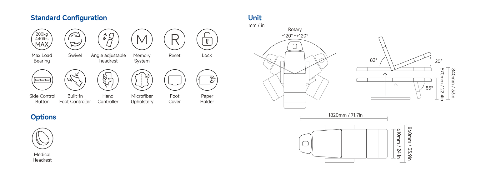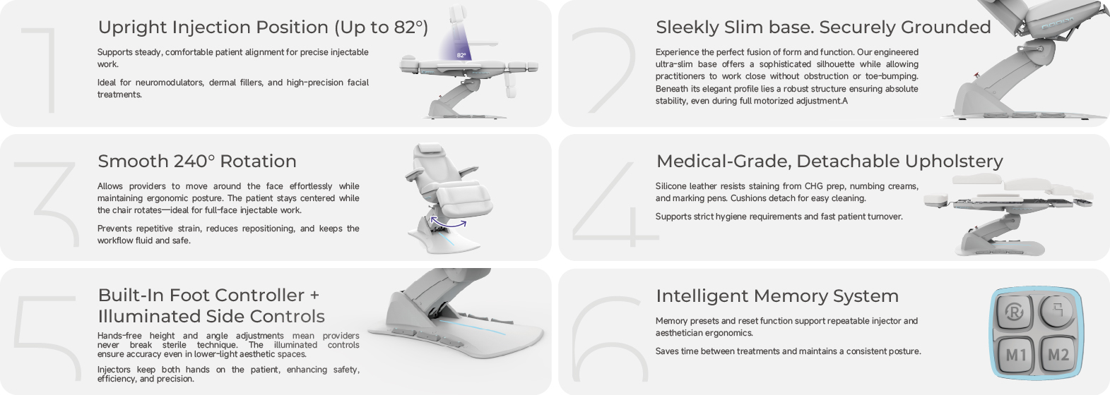 Featuring an irreplaceable ultra-thin base that blends visual lightness with unwavering stability to elevate your space and brand. Powered by 4 motors, it delivers full functionality including 240° flexible rotation, dual memory settings, one-touch reset, and built-in foot controller. The chair also comes with a detachable upholstery, ambient lighting, and adjustable headrest. Premium essentials such as silicone leather, a hand controller, and a PVC foot cover are all included as standard for a ready-to-perfect experience. Professionally certified to meet medical, FDA, and UL standards, it is the trusted solution for beauty salons and advanced aesthetic centers, perfect for dermatology and medical examinations.